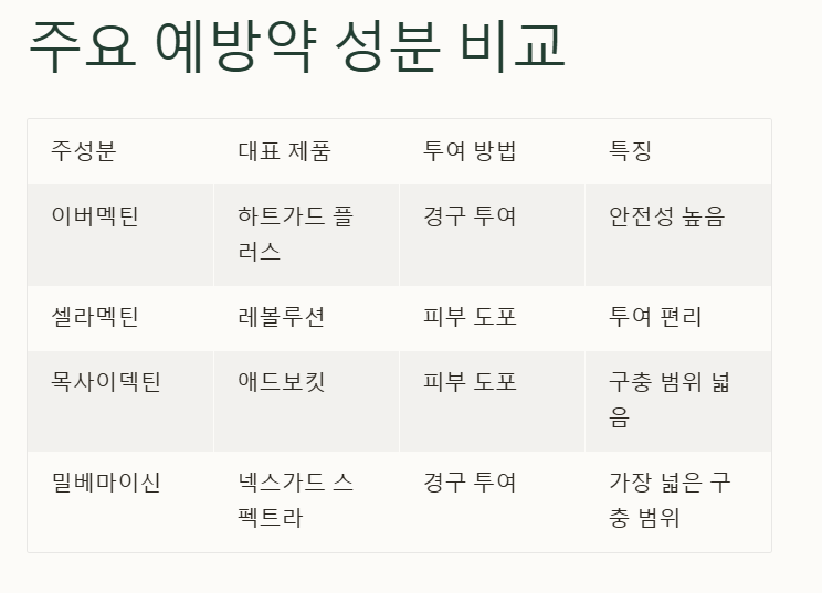 심장사상충 예방약의 4가지 주요 성분 비교