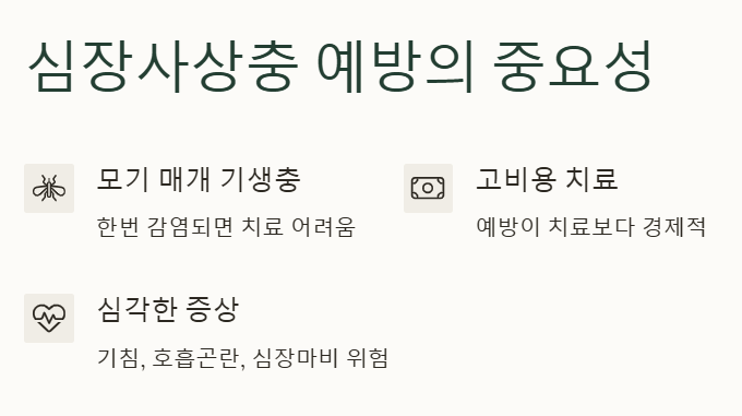 심장사상충은 모기를 통해 전파되는 기생충으로, 한번 감염되면 치료가 매우 어렵고 비용도 많이 듭니다. 특히 증상이 나타났을 때는 이미 심각한 상태인 경우가 많아 예방이 무엇보다 중요합니다.