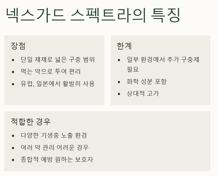 - 넥스가드 스펙트라: 최신 약물로 가장 넓은 구충 범위, 단일 제제로 다양한 기생충 방제 가능