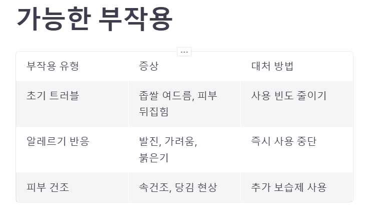 | 초기 트러블 | 좁쌀 여드름, 피부 뒤집힘 | 사용 빈도 줄이기, 심할 경우 일시 중단 |