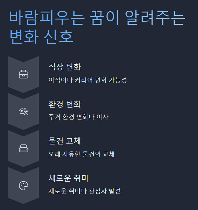 바람피우는 꿈은 당신의 삶에 새로운 변화의 바람이 불고 있다는 신호일 수 있습니다. 이런 꿈을 꾸었다면 다음과 같은 변화가 당신의 삶에 찾아올 가능성이 있습니다.