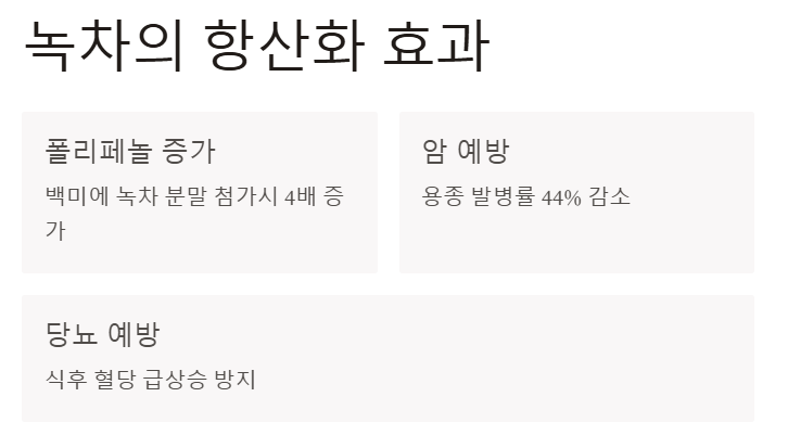 한국식품영양과학지에 발표된 논문에 따르면, 백미 200g에 녹차 분말 3g을 넣고 밥을 지으면 항산화 성분인 폴리페놀과 플라보노이드가 크게 증가하며, 특히 폴리페놀 함량이 약 4배 증가합니다.