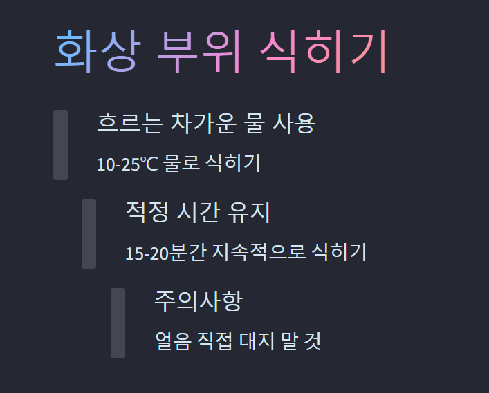 화상 사고가 발생했을 때 올바른 응급처치는 회복 과정과 결과에 큰 영향을 미칩니다. 다음 5단계를 따라 체계적으로 응급처치를 시행하세요.