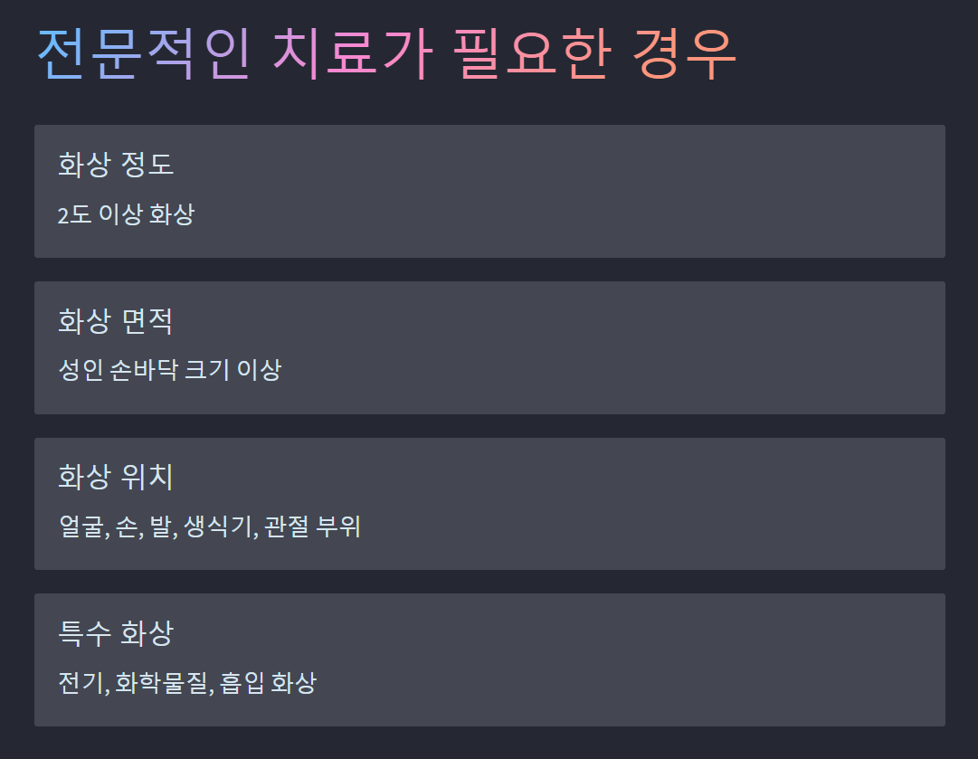 화상의 깊이와 면적을 정확히 판단하는 것은 전문가에게도 어려울 수 있으므로, 의심스러운 경우 의사의 진료를 받는 것이 좋습니다.