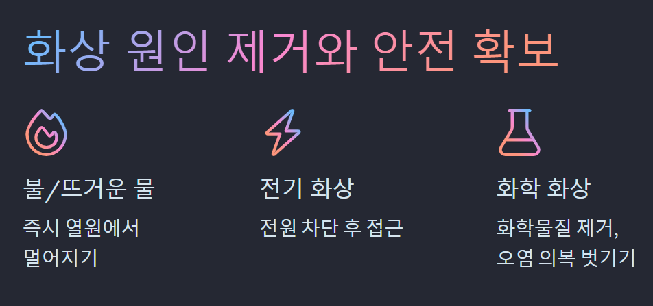화상 사고 시 본인과 주변인의 안전을 먼저 확보하는 것이 중요합니다. 특히 화재나 전기 사고의 경우 2차 피해가 발생할 수 있으므로 주의하세요.