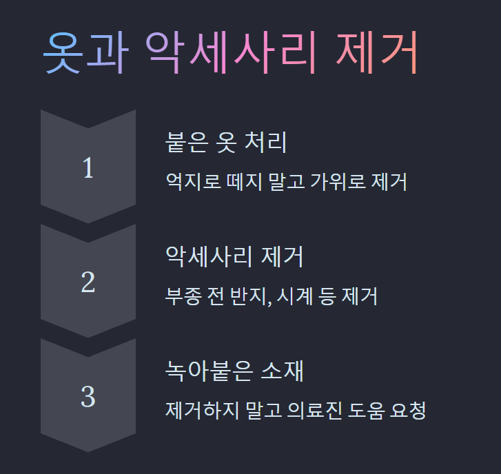 화상 부위 주변의 옷과 악세사리 등은 조심스럽게 제거해야 합니다.
