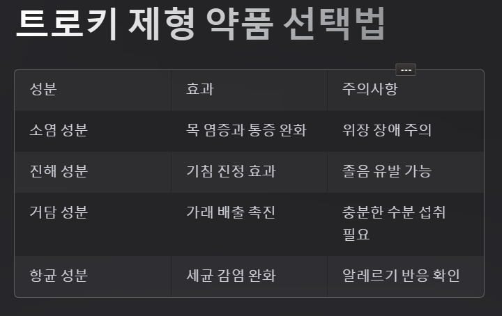 | 소염 성분 | 목 염증과 통증 완화 | 위장 장애가 있는 경우 주의 |